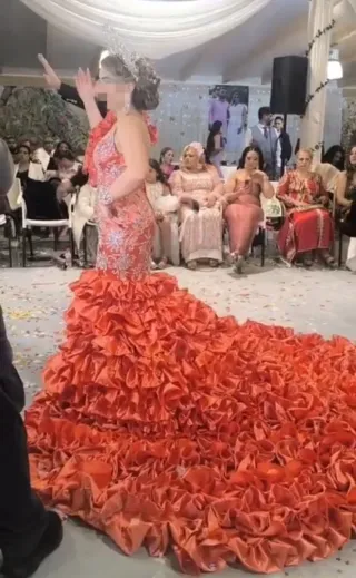 Hermoso vestido elegante Axila 90cm Cintura 75 a 80cm Cadera 90cm Largo por delante 1.75cm Parte de atrás largo 2 metros de largo desde cintura hacia bajo largo Muy hermoso vestido tiene costura x si quieres agradarle a otra talla Vestido súper elegante Ver otros perfil