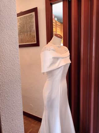 Elegante vestido de novia con un diseño sofisticado. - Escote Bardot con detalle de encaje. - Corte sirena que realza la figura. - Falda con una ligera cola. -el vestido tiene estas medias: ESPADA: 38 CINTURA: 64 PECHO: 84 CADERA: 101 Largo de ESPALDA → 42 Largo de DELANTERO → 39 Largo TOTAL → 138 Largo ESPALDA → 160 con caída -El vestido está sin estrenar -El precio del vestido es de 600 € pero estoy abierta negociación.