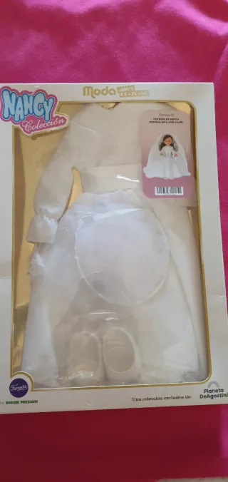 Precioso vestido de novia para la muñeca Nancy, perteneciente a la colección Moda años 60,70 y 80. Incluye un delicado velo con flores como tiara. - Vestido de novia blanco con toques románticos y lencero. - Velo a juego. - Certificado de autenticidad numerado (2299). - Colección exclusiva de Planeta DeAgostini. Juguetes y muñecas Chabel Barriguitas