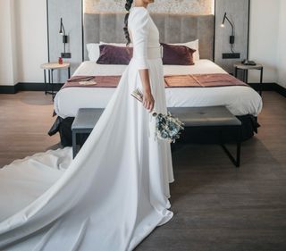 Vestido de novia de la marca Aire Barcelona. - Diseño elegante y sofisticado. - Color blanco clásico. -Precio original 1600€ -Regalo Velo valorado en 500€ - Habris que llevarlo a la tintorería.