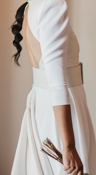 Elegante vestido de novia. - Diseño con espalda descubierta. - Mangas largas abullonadas. - Escote pronunciado en la espalda.