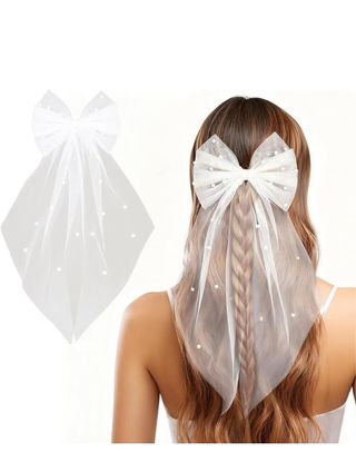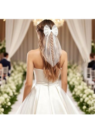 Precioso velo de novia con un lazo decorado con perlas. - Diseño con lazo. - Adornado con perlas.