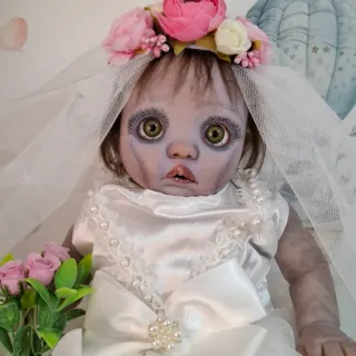 Muñeca estilo Reborn con un diseño único de novia cadáver. Perfecta para coleccionistas. - Detalles realistas en el rostro. - Vestido de novia blanco con perlas. - Corona de flores rosas y blancas.
