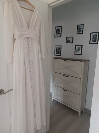 Vestido de novia modelo Xies de Aire Barcelona. Usado apenas unas horas porque use segundo vestido. Lavado en tintorería y sin desperfectos. Precio original 2400€. Se entrega con cancán de regalo y guardapolvo original. Mi talla es la 36, mido 170cm y me lo puse con tacón de 5cm. Medidas aproximadas 100- 70 - 100. Se puede probar en Sevilla.