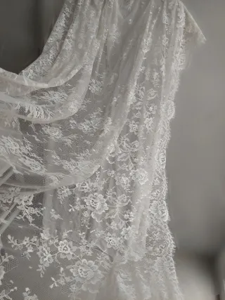 Elegante velo de novia de encaje chantillí en color beige, con un diseñocreado en el año 1910. - Elaborado con delicado encaje chantillí. - Tonalidad beige clásica y atemporal. - Diseño de época que aporta un toque vintage.