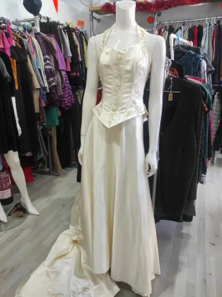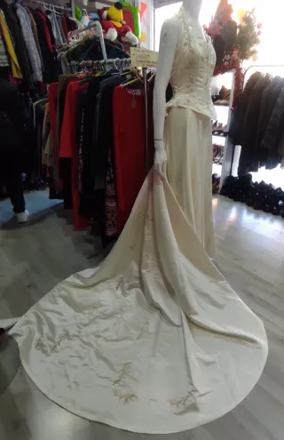 Elegante vestido de novia con un diseño sofisticado y una hermosa cola. Se abotona también al cuello. Es precioso. Medidas en las fotos. - Diseño halter. - Cuerpo y cola de 2 metros, con detalles bordados. - Falda larga lisa con cola desmontable - Color marfil. Tiene alguna mancha, nada roto ni deteriorado.