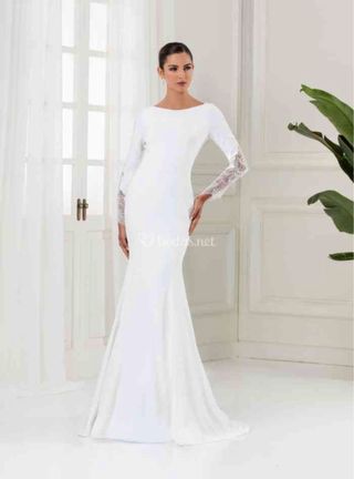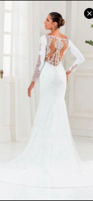Vestido de novia elegante, sin usar y con etiqueta. Talla 40-42 - Diseño de corte sirena. - Mangas largas con detalles de encaje. - Escote barco. medida: Cintura 74 pecho 95 Cadera 105