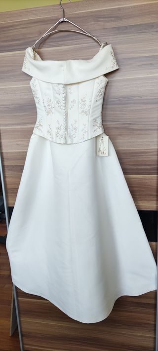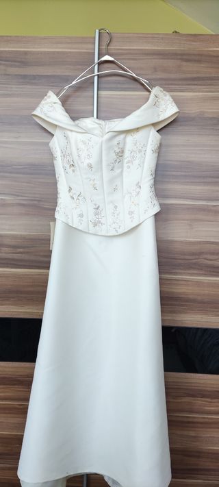 Vestido talla 44 color marfil falda y corpiño, el corpiño bordado en tonos marfiles más oscuros. Se puede sacar una talla. Procede de un comercio de novias por cierre