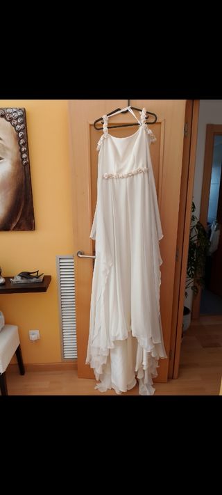 Para novia en caso de boda civil o para invitada. Talla 38 En las fotos no se puede apreciar en todo su esplendor. Un vestido para destacar. Se regala estola de pelo beige y flor del mismo color del vestido para el pelo.