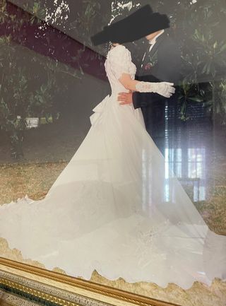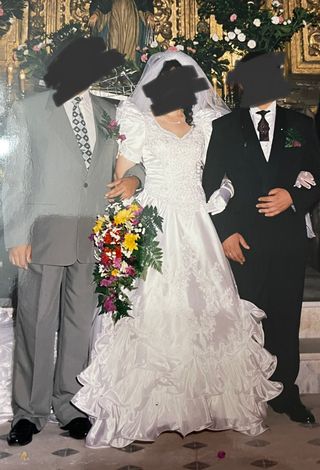 Traje de Novia vintage confeccionado en encaje y raso,incluye también pedrería en la cintura.Tiene debajo del encaje forro de raso en el talle y tres forros de raso y tela de velo en la falda para darle volumen. También incluye un can can si se quiere dar más volumen a la falda del vestido. La talla del vestido es una 38 y el vestido mide desde el cuello hasta el bajo de la falda 150 cm. El talle desde el cuello hasta la cadera 54 cm.El largo de falda desde la cadera 103 cm. La espalda va toda abotonada desde el cuello hasta un poco más abajo de la cadera. Se puede apreciar en la foto número 10 una pequeña mancha en la parte superio