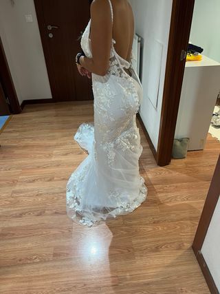 Vestido muy bonito.Pueeta solo una vez.Tiene mucha cola.Queda precioso
