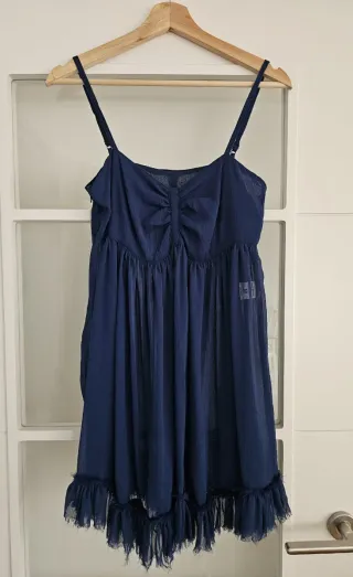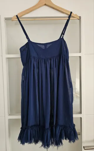 Vestido Zara, color azul marino combinado, parte superior tirantes con escote en espalda, y parte inferior de topos azules, cremallera lateral. Talla XS. Con algun uso pero muy buen estado. Tejido elastico. Medidas Sisa 36 cm Cintura 31 cm Cadera 39 cm Largo 106 cm