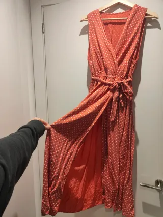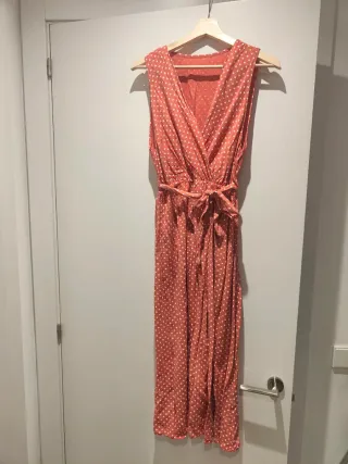 Vestido de verano con estampado de topos. - Diseño cruzado. - Cinturón para anudar. - Sin mangas. Solo dos usos.