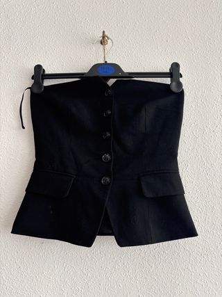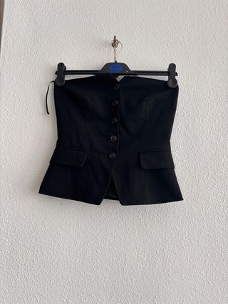 Top de vestir sin tirantes, con un diseño elegante y moderno. - Cierre de botones en la parte delantera. - Bolsillos de solapa en los laterales. - Corte entallado que estiliza la figura.