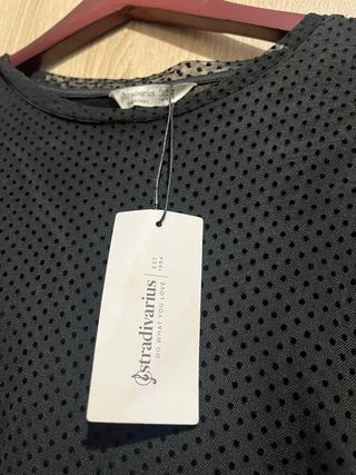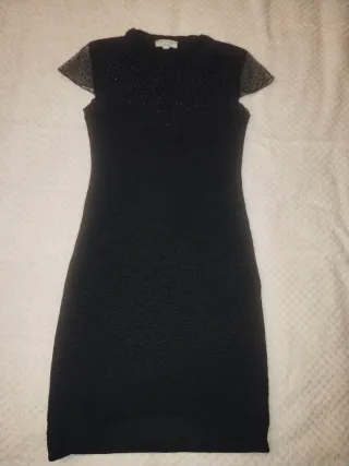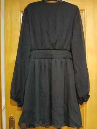 Vestido negro de la marca SHEIN, sin estrenar. Presenta un diseño elegante con mangas abullonadas de tul con topos. - Escote cuadrado. - Mangas largas transparentes con estampado de topos. - Falda con vuelo.