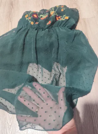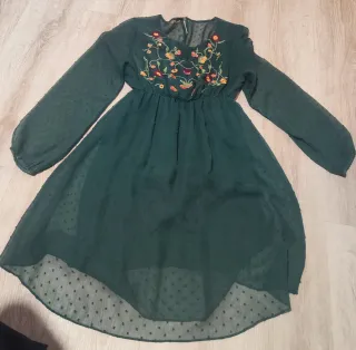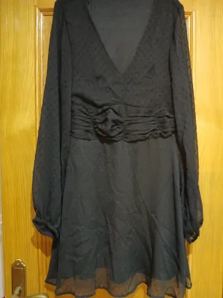 Vestido corto de manga larga con un bonito bordado floral en la parte delantera. No tiene ningún desperfecto ni rotura, talla única para haceros una idea suelo usar una M o L en vestido, da para una 40-42. La tela tiene un sutil estampado de topos. - Manga larga abullonada. - Cintura elástica. - Escote redondo. - Diseño vaporoso. - Forro debajo del tul tupido.