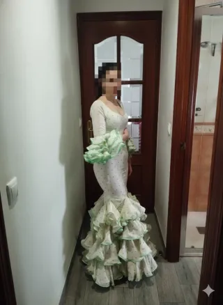 Vestido de flamenca blanco con lunares verdes. Ideal para ferias - Diseño con volantes. - Mangas finas con volantes. - Escote delantero poco pronunciado, escote trasero más pronunciado (pero no se ve el sujetador)