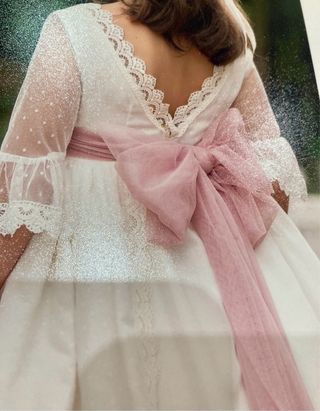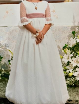 Vestido de comunión en excelente estado, con un diseño delicado y elegante. - Mangas de tul con topos y encaje. - Fajín de tela satinada. - Lazos grandes en la espalda. - Falda con tul de topos y puntilla en el bajo.