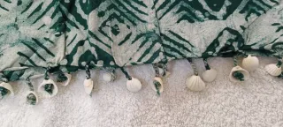 Vestido corto con un bonito bordado dorado en la zona del escote estilo boho. El tejido es ligero y tiene detalles de rayas finas y topos en tono dorado sutil. - Escote en V con cordones. - Mangas acampanadas. - Adornos de flecos y pompones en los bajos y mangas. - Detalles bordados en hilo dorado. No es blanco blanco diria que tira un poco a crudo o beige claro