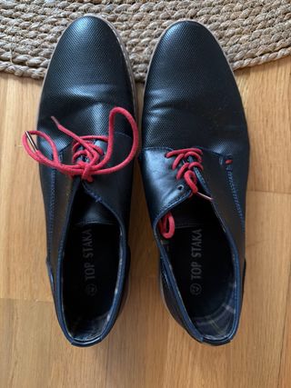 Elegantes zapatos de vestir en color negro. Perfectos para ocasiones formales o para dar un toque arreglado a tu atuendo. - Diseño moderno con cordones rojos. - Material con textura. - Suela de goma.