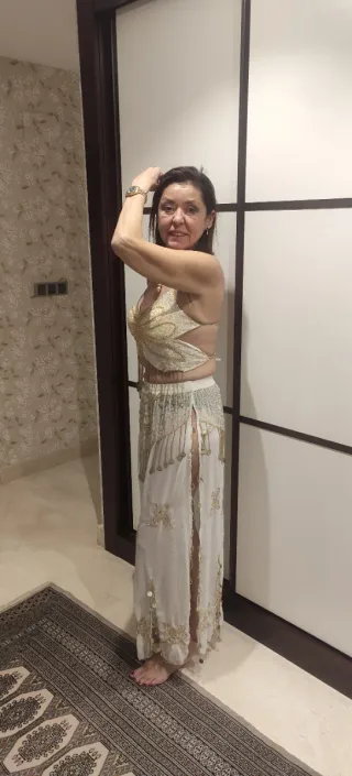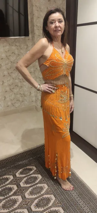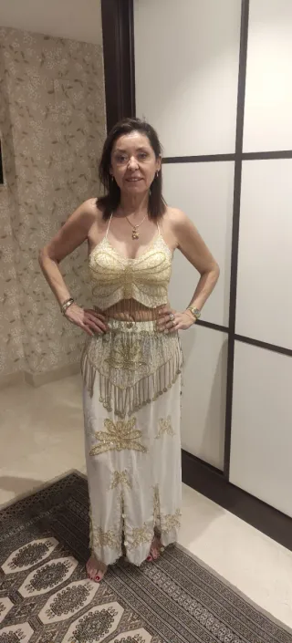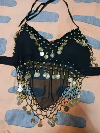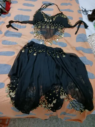 Conjunto de dos piezas para danza del vientre, compuesto por un top y una falda. Talla S-M - Tipo Shakira - Top con detalles dorados y pedrería. - Falda larga con adornos y flecos. - Diseño elegante y llamativo.