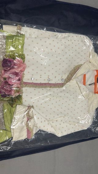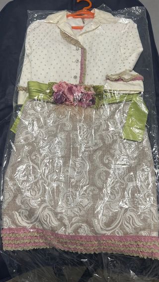 Vestido de la marca María Picaretta. Solo usado en un evento. - Diseño con estampado de topos dorados. - Fajín verde con flores decorativas. - Falda con estampado floral en relieve. - Detalles de volantes en puños y cuello.