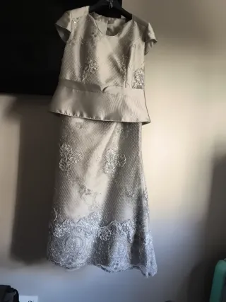 Elegante vestido de tres piezas para madrina. El conjunto está adornado con detalles de pedrería y encaje. - Diseño de dos piezas: top y falda larga. - Tejido con brillo sutil. - Adornos florales plateados.