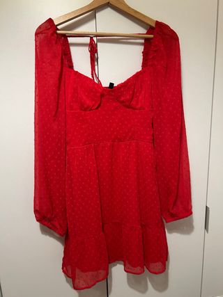 Vestido corto de manga larga con un diseño elegante y femenino. - Tejido ligero con estampado de topos. - Escote cuadrado con detalle de volantes. - Mangas abullonadas con puños elásticos. - Cintura marcada y falda con vuelo. - Cierre de lazada en la espalda.