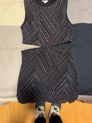 Conjunto de dos piezas, top y falda, con un llamativo estampado geométrico. - Diseño de corte moderno. - Tejido brillante con detalles multicolores.