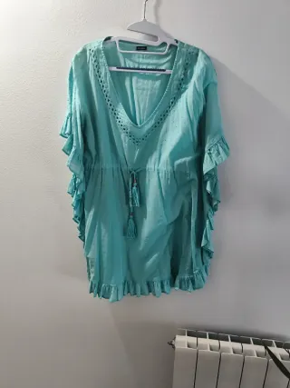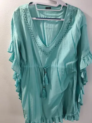 Vestido ligero ideal para la playa o piscina. Su diseño vaporoso y detalles lo hacen muy especial. - Escote en V con detalles de encaje. - Cintura ajustable con cordón y borlas. - Mangas acampanadas con volantes. - Bajo con volante. - Tejido ligero con pequeños topos.