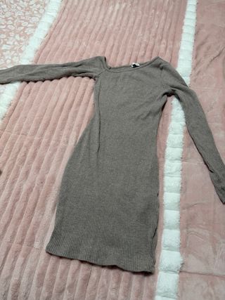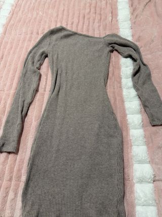 Vestido tipo canalé ajustado con cuello asimétrico y manga larga. Color topo. Como nuevo, solo una puesta. - Diseño ajustado. - Tejido acanalado.