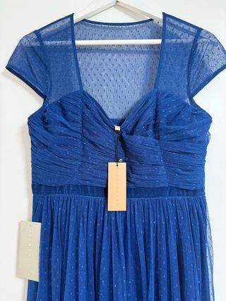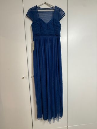 Vestido de fiesta elegante, ideal para ocasiones especiales. Nuevo y con etiqueta. Precio 100€ - Diseño largo y vaporoso. - Tejido con detalles de topos. - Cuerpo drapeado y escote en V. - Mangas cortas de tul.