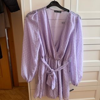 Vestido de fiesta con un diseño elegante y moderno. - Tejido semitransparente con pequeños topos. - Manga larga. - Corte acampanado.