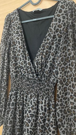 Vestido midi de Stradivarius con estampado animal print. Es una prenda elegante y cómoda. - Diseño con escote en V. - Cintura elástica fruncida. - Mangas largas abullonadas. - Largo midi. Vestido midi de Stradivarius en talla S, con estampado animal print en tonos negros y gris topo, tejido ligero y con forro interior para que no transparente. Escote en pico cruzado, goma fruncida en la cintura que estiliza mucho y mangas largas con puño elástico, ideal para entretiempo o invierno con medias. Está en perfecto estado, solo usado en dos ocasiones, sin manchas ni enganches.