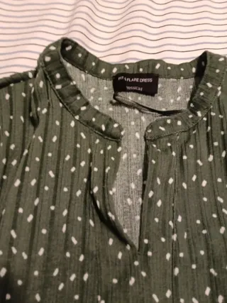 Vestido de manga larga con un estampado de topos negros sobre fondo verde. Presenta un cuello camisero y cierre de botones en la parte delantera. - Diseño con volantes en la parte inferior. - Mangas largas con puños abotonados.