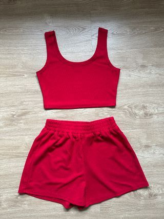 Pack de Shein compuesto por un crop top de tirante ancho y unos shorts con goma en la cintura, acanalados, de color rojo. Talla M. Muy buen estado. Precio original 10,99 €. Se vende porque no es mi talla. Los pantalones son de cintura alta.