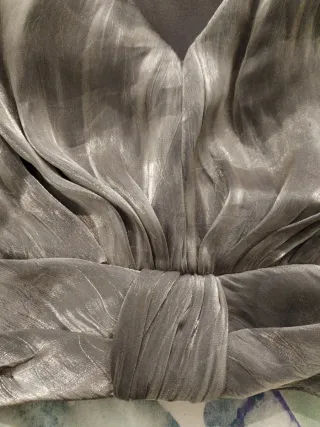 top corto de Zara con un llamativo escote en V y un acabado satinado color plata - Diseño cruzado con nudo frontal. - Mangas cortas abullonadas. - Tejido ligero y brillante. Offerta mudanza Precio: 3 € (no negociable). Vendo más prendas, todos por 3 €, ver perfil. O pack de todos los vestidos por 50€. Entrega en mano en Madrid, metro Prosperidad.