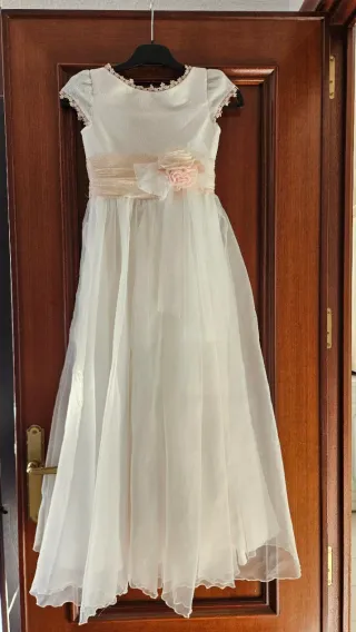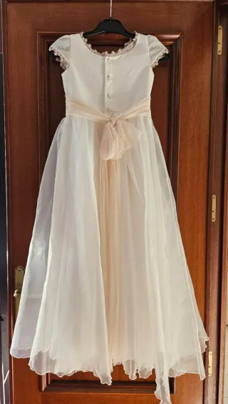 Vestido de comunión de la marca Tizzas, comprado en El Corte Inglés. - Diseño elegante y delicado. - Tejido con relieve de topos. - Cinturón de tela a juego. - Mangas cortas con volante. - Bajo con puntilla. Talla 10/12 años Una puesta, limpio de tinte. Largo total 1,04 cm Largo desde cintura 81 cm. El tejido es plumeti y organdí El forro de algodón y volante de tul.