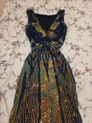 Nuevo. Costaba 60€ vestido, de lentejuelas sin usar en tonos azul, verde agua marina y dorado. con una variedad de brillos, cortito ajustado a la cintura y muy favorecedor, con escote, con cremallera y apertura en la espalda.