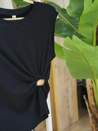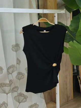 Descripción: Elegante top negro sin mangas de cuello redondo. Destaca por su original drapeado lateral que se recoge en una anilla metálica dorada, creando un efecto visual muy favorecedor que estiliza la cintura. Estilo: Ideal para salir de noche, cenas o un evento especial. Combina perfecto con pantalones de vestir o jeans para un look más casual-chic. Estado: En excelente estado, tejido elástico y cómodo. #TopNegro #Drapeado #ModaMujer #Fiesta #LookElegante #BasicWithATwist #EstiloSofa