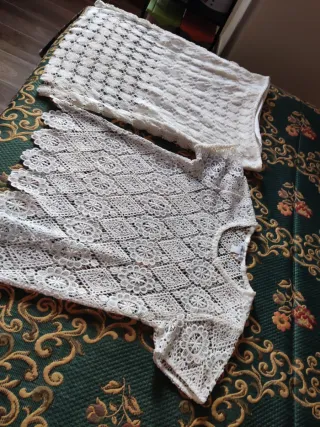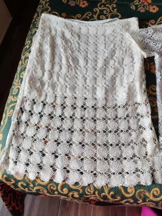 Prenda de vestir de encaje beige para señora. Su diseño intrincado la hace ideal para ocasiones especiales o para añadir un toque elegante a cualquier atuendo. Falda y top beige encaje 10 euros, 5 cada prenda. - Falda negra tubo elástica,talla 40, 4 euros. - Falda larga plisada,con forro,color salmón,,cintura ajustable, 6 euros,talla única,pero da para 42 y más.