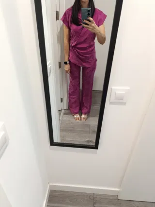 Elegante conjunto de dos piezas para invitada. - Diseño asimétrico en color fucsia. - Pantalón de corte recto. - Tejido con textura. Puesto una vez, como nuevo