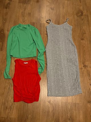 Conjunto de tres prendas de ropa en talla XS. Incluye un vestido largo y 2 tops. - Vestido largo de tirantes acanalado. - Top verde de manga larga y cuello alto. - Top rojo sin mangas con fruncido.
