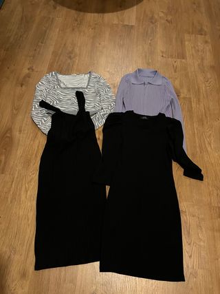 Conjunto de cuatro prendas de ropa en talla M. Incluye dos vestidos negros y dos tops. - Top gris con estampado de cebra y escote cuadrado. - Top lila de canalé con cremallera. - Vestido negro de canalé con tirantes. - Vestido negro de manga abullonada.
