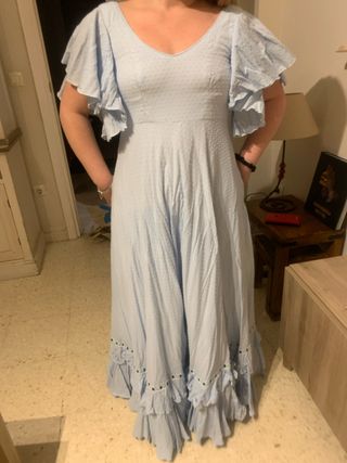 Traje de flamenca de color celeste con un estampado de pequeños topos blancos. El diseño presenta volantes en las mangas y varias capas de volantes en la falda. - Diseño con volantes en mangas. - Falda con múltiples capas de volantes. Tejido de crespón, muy ligero y no necesita plancha. Con bolsillo escondido. Se puede sacar de la tela para ajustar