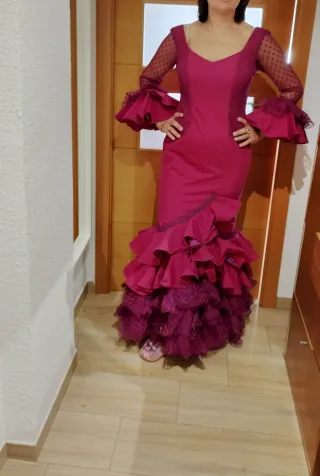 Vestido de flamenca con un diseño elegante y detalles únicos. - Mangas largas con volantes y tejido de topos. - Cuerpo ajustado con detalles de volantes en la falda. - Tejido con topos semitransparente en las mangas.