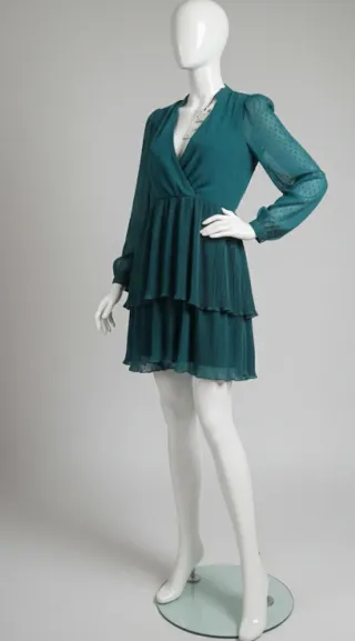 Vestido elegante de manga larga con un diseño cruzado y detalles de volantes en cascada. La tela tiene un sutil estampado de topos. - Mangas abullonadas con puños. - ESscote en V. - Cintura marcada. - Doble capa de volantes en la falda.