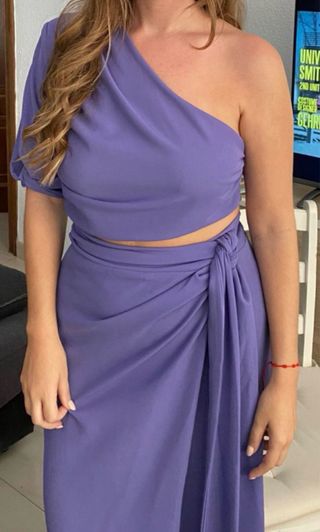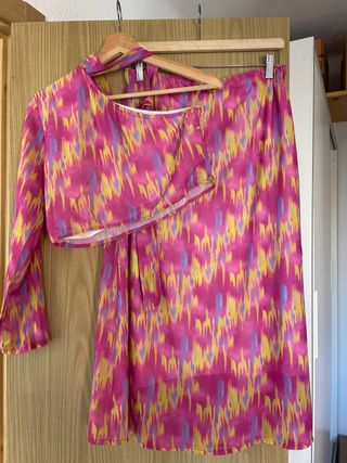 Vestido de la marca Mariquita Trasquila - Diseño de un solo hombro. - Falda cruzada con abertura. - Conjunto-Vestido. Top con una manga media, un hombro descubierto y falda. Se paso el periodo de devolución y no ha sido usado nunca.