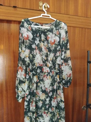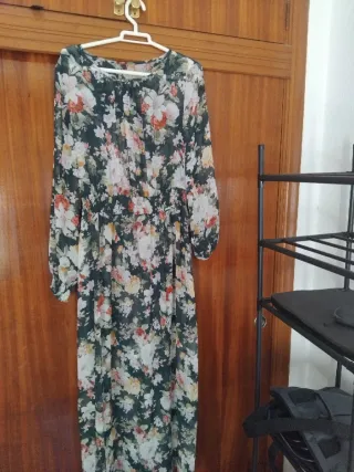 Vestido largo romántico con estampado floral y estilo boho. - Diseño vaporoso y ligero. - Mangas largas. - Cintura elástica para un ajuste cómodo. - Look romántico y primaveral. - Ajustable (42-44). - Necesita body o top interior, la tela es bastante transparente. - Largo: hasta los pies.