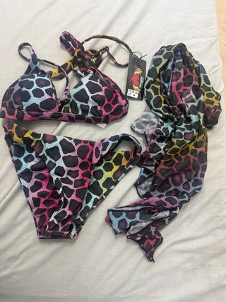 Conjunto de bikini y pareo con estampado de leopardo. Ideal para lucir en la playa o piscina. - Diseño llamativo. - Incluye top, braguita y pareo. - Tejido cómodo y de secado rápido. En diferentes colores se vende por unidad o por lote completo son 13 vestidos de baño todos nuevos en tallas S-M-L